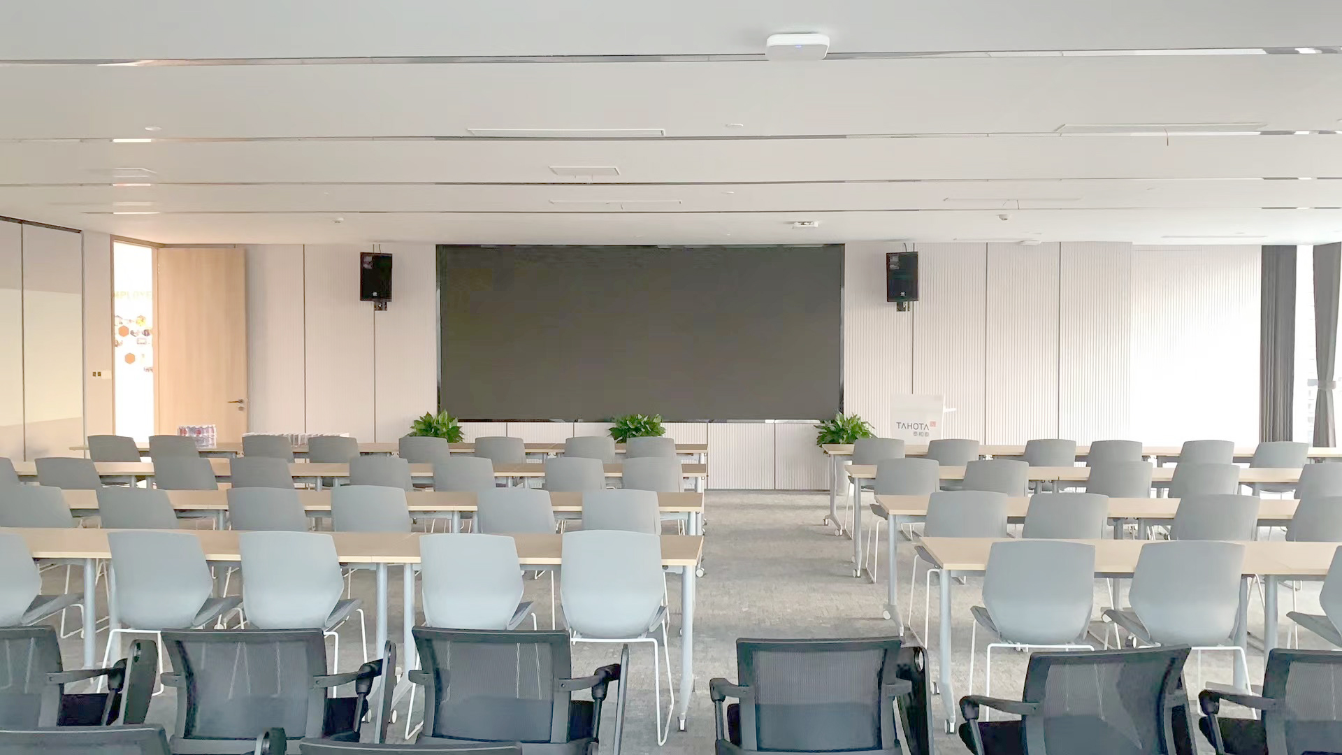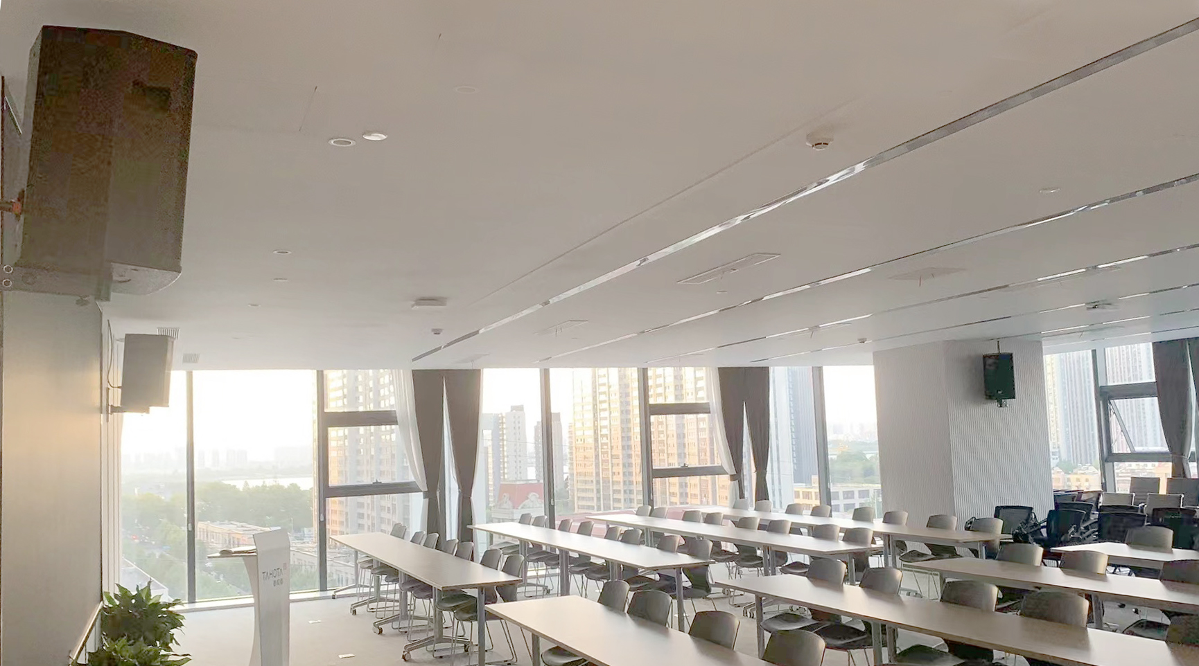 本次我司為其新裝修辦公樓打造會議場所,滿足其日常大會、客戶參觀講解等需求?,F(xiàn)場采用四只全頻音箱,搭配處理器、反饋抑制器,滿足不同場景使用需求,日常會議時人聲清晰,講解演示視頻時聲音飽滿??紤]到日常會議發(fā)言人數(shù)多,我司為其選配5g會討話筒;講解演示時需要流動講解,搭配專用手持話筒。音頻與大屏聯(lián)動,電腦連上高清線即可出畫面至大屏出聲音至音箱。